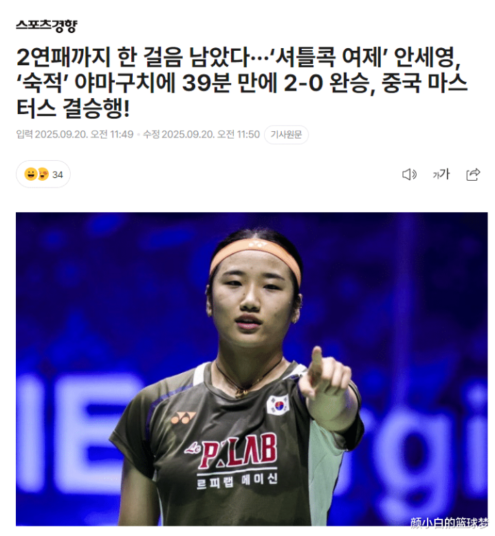 韩媒《体育倾向》在赛后发文:羽毛球女王距离二连冠只差1胜,安洗莹短短39分钟就横扫日本王牌山口茜。
